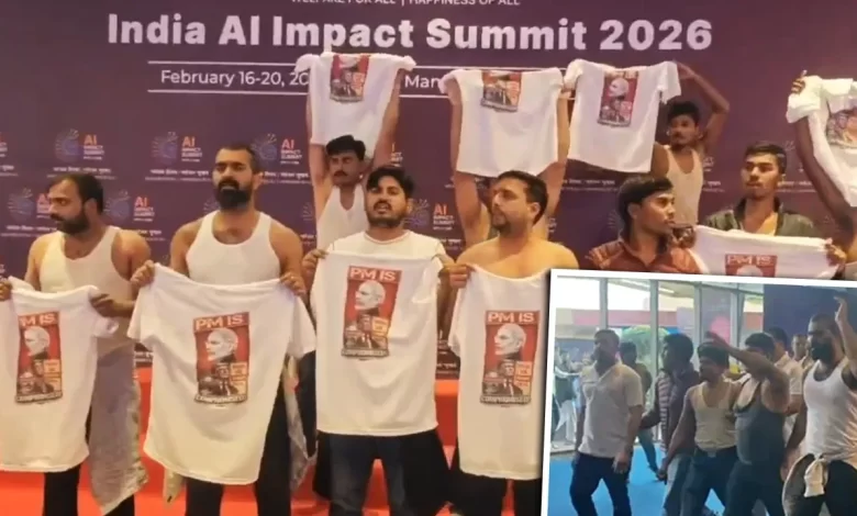 AI समिट में बवाल: बीच कार्यक्रम में यूथ कांग्रेस कार्यकर्ताओं ने उतारी टी-शर्ट! ट्रेड डील के खिलाफ प्रदर्शन से मचा हड़कंप